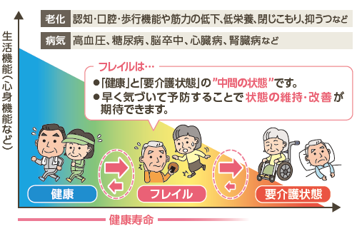 フレイルとは、高齢期に体力や気力、認知機能など、からだとこころの機能(はたらき)が低下し、将来介護が必要になる危険性が高くなっている状態をいいます。