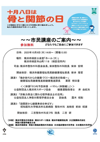 横浜市整形外科医会との共催し、ロコモティブシンドローム減少を目的とした令和7年度「運動器の健康 骨と関節の日」市民公開講座を開催します。